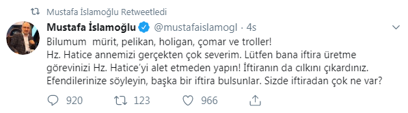Konuyla ilgi resmi twitter hesabından açıklamalarda bulunan İslamoğlu, ''Bilumum mürit, pelikan, holigan, çomar ve troller! Hz. Hatice annemizi gerçekten çok severim. Lütfen bana iftira üretme görevinizi Hz. Hatice’yi alet etmeden yapın! İftiranın da cılkını çıkardınız. Efendilerinize söyleyin, başka bir iftira bulsunlar. Sizde iftiradan çok ne var?'' ifadelerini kullandı.